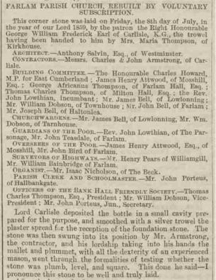 From the Carlisle Journal is a copy of the text placed in a bottle next to the foundation stone by the Earl of Carlisle.